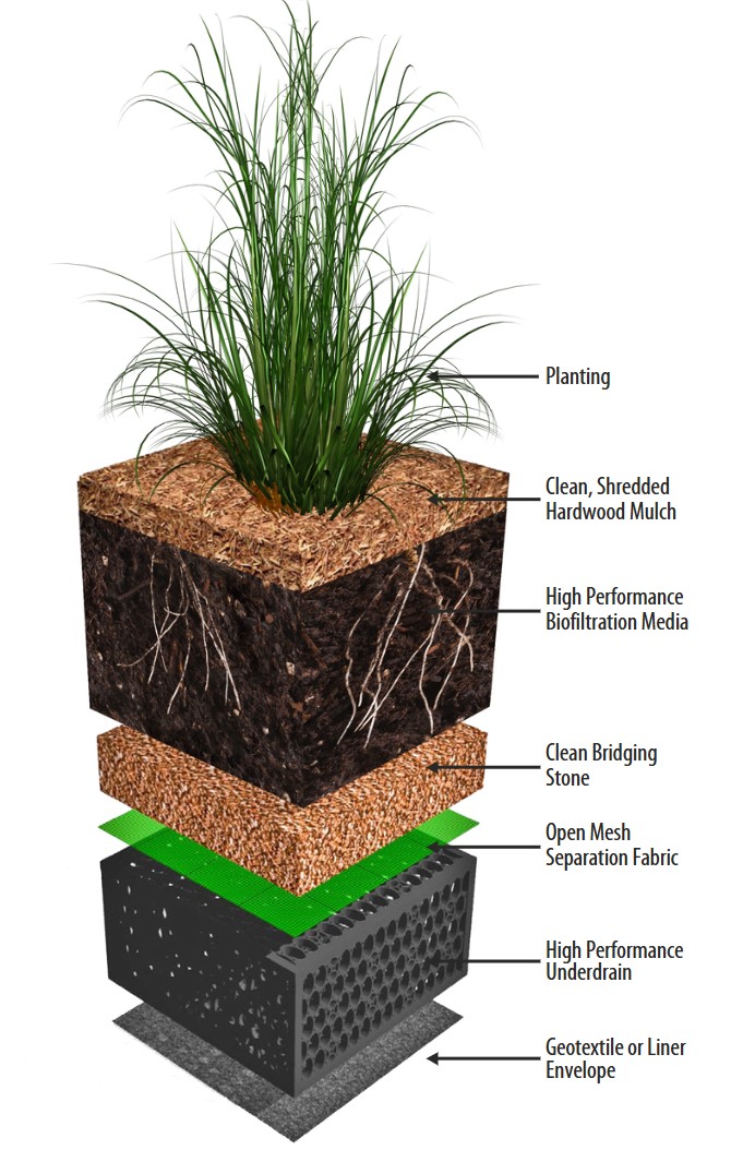 FocalPoint utilizes physical, chemical and biological mechanisms of a soil, plant and microbe complex to achieve pollutant removal rates consistent with traditional bioretention, and the option of increased removal characteristics for specific pollutant targets.